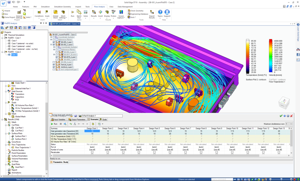 Phần mềm Solid Edge với cấu hình so sánh và đặc tính khả năng nghiên cứu tham số bên trong FloEFD cho phép các kỹ sư hiểu được ảnh hưởng của những thay đổi trong hình học hoặc điều kiện biên đối với kết quả. Người dùng có thể đánh giá phong bì thiết kế bằng cách đánh giá kết quả bằng các giá trị số, biểu đồ hoặc hình ảnh trực quan và hình ảnh động và từ đó so sánh một loạt các hoán vị dự án.